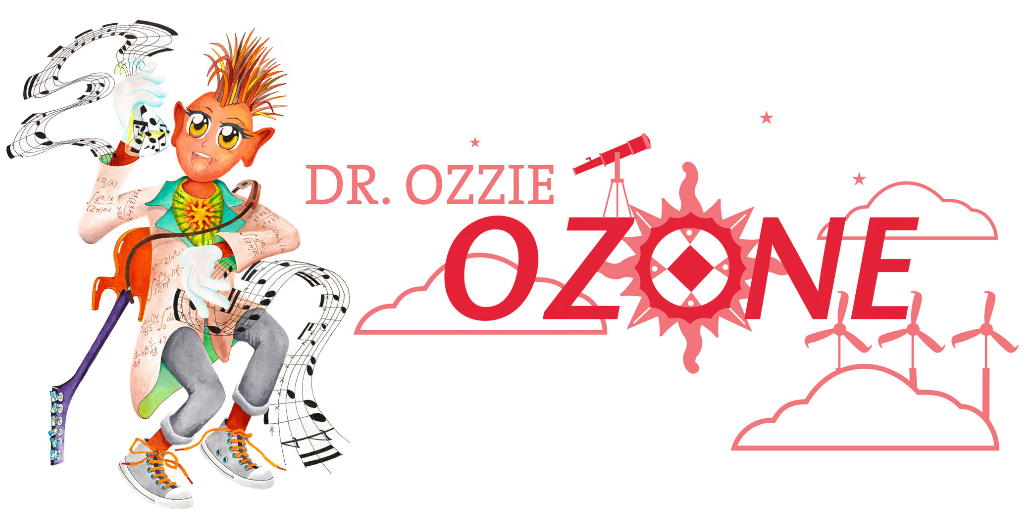 He is an expert in clean air, pollution and predicting the weather. A lover of rock and roll music, he has been known to jam out on his guitar or dance around his well-equipped lab in the clouds while concocting new creations and wacky experiments.  He enjoys predicting the weather and if necessary can stir up quick tornadoes or conjure up electromagnetic waves. He has a wind glider, but it is his flashy 3D safety glasses that enable him to travel anywhere he needs to go. Dr. O spreads his generosity everywhere he travels.