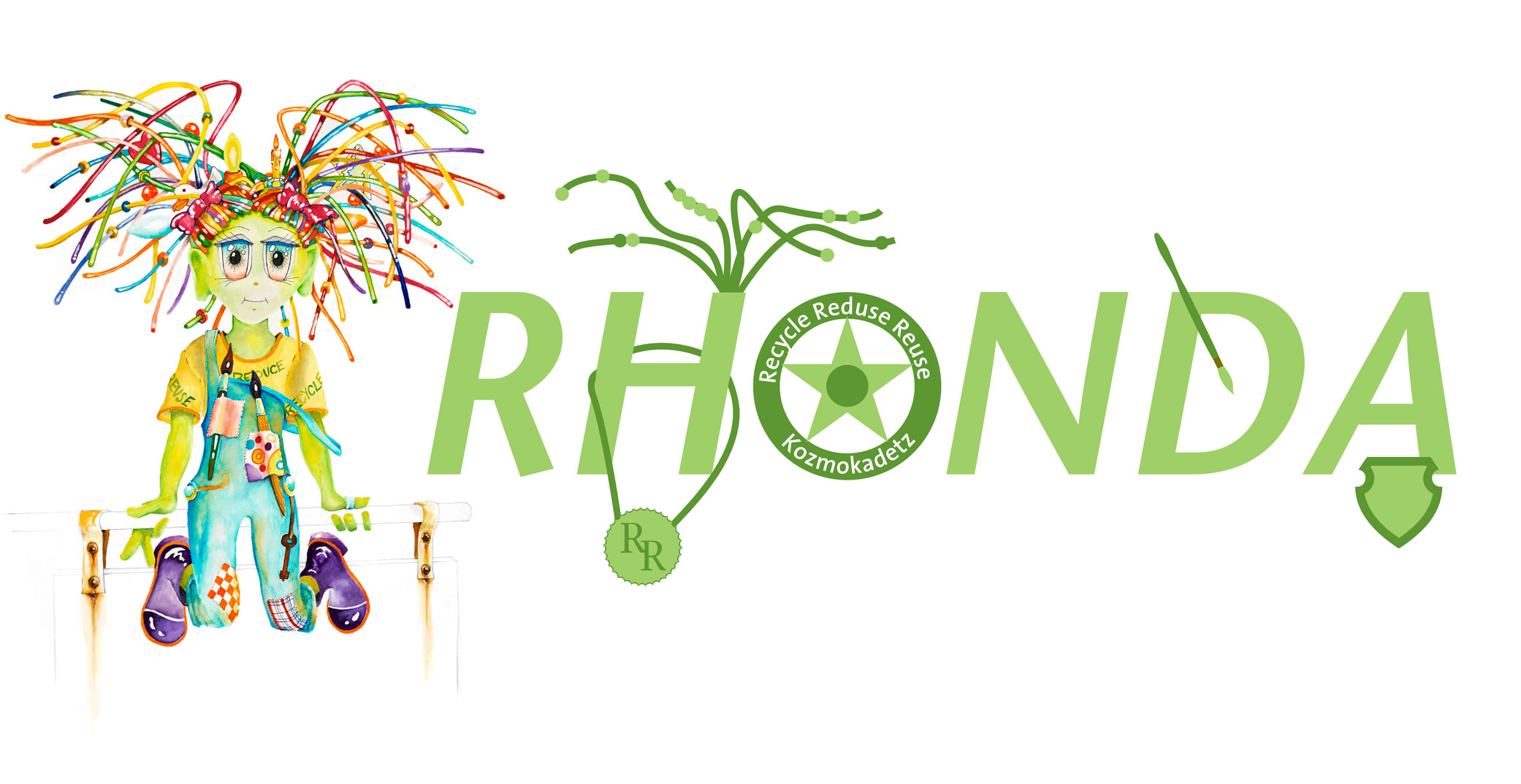 This cute, strong-willed imp will be grooving as her inner artist has flair.  She speaks her mind and scorns wastefulness.  She travels via her recycled "Kreative Krown"., and also has a bike that creates clean energy as she pedals.  She uses that energy to “power up” her studio as she travels from one time zone to another.
