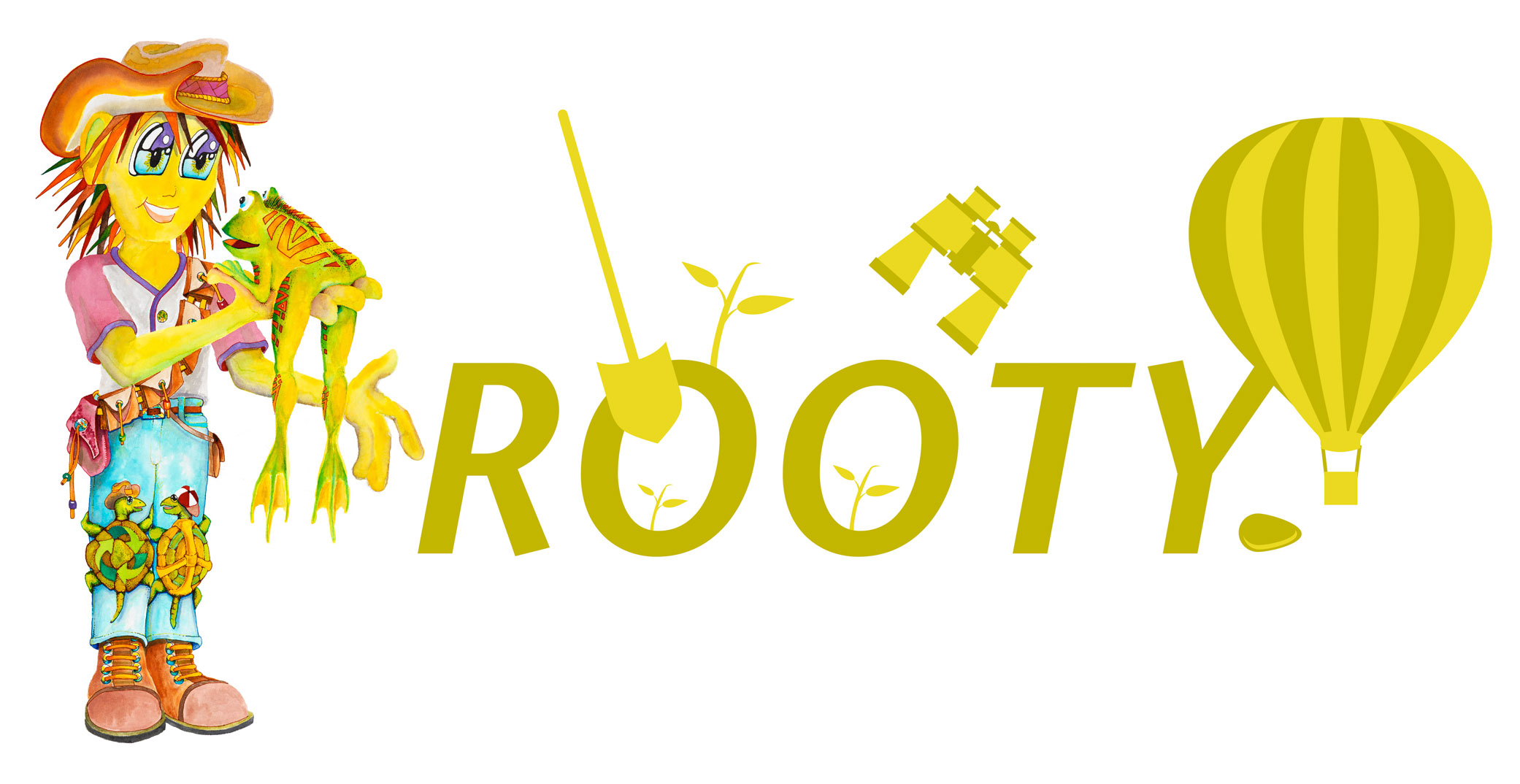 His favorite thing to do is to float above the treetops in his hot air balloon. The trees are his friends and he knows the secrets of their power and strength.  When Rooty needs to travel, he reaches into one of his pockets, takes out seeds, blows them into the wind and off he goes. Living in his eco- friendly tree house he is extremely honest and builds trust with all of nature. He carries a backpack with a solar panel to recharge his computer.